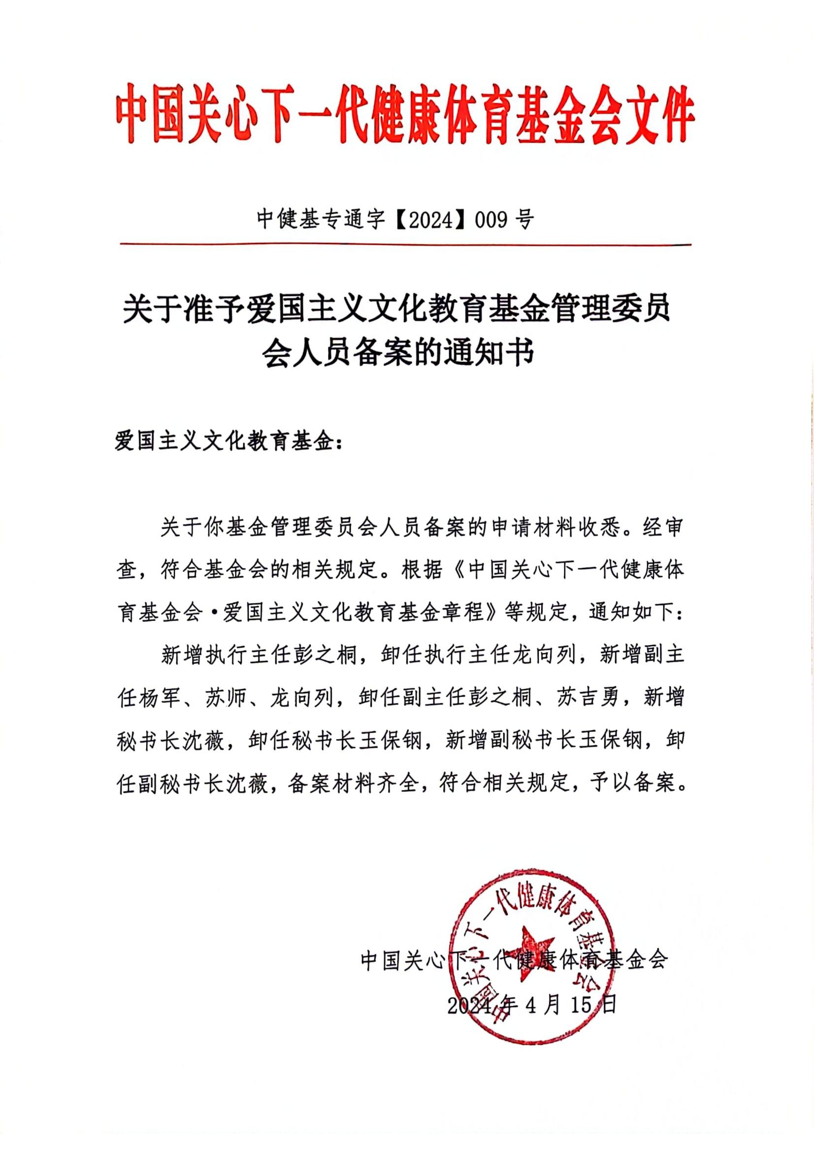 关于准予爱国主义文化教育基金管理委员会人员备案的通知书