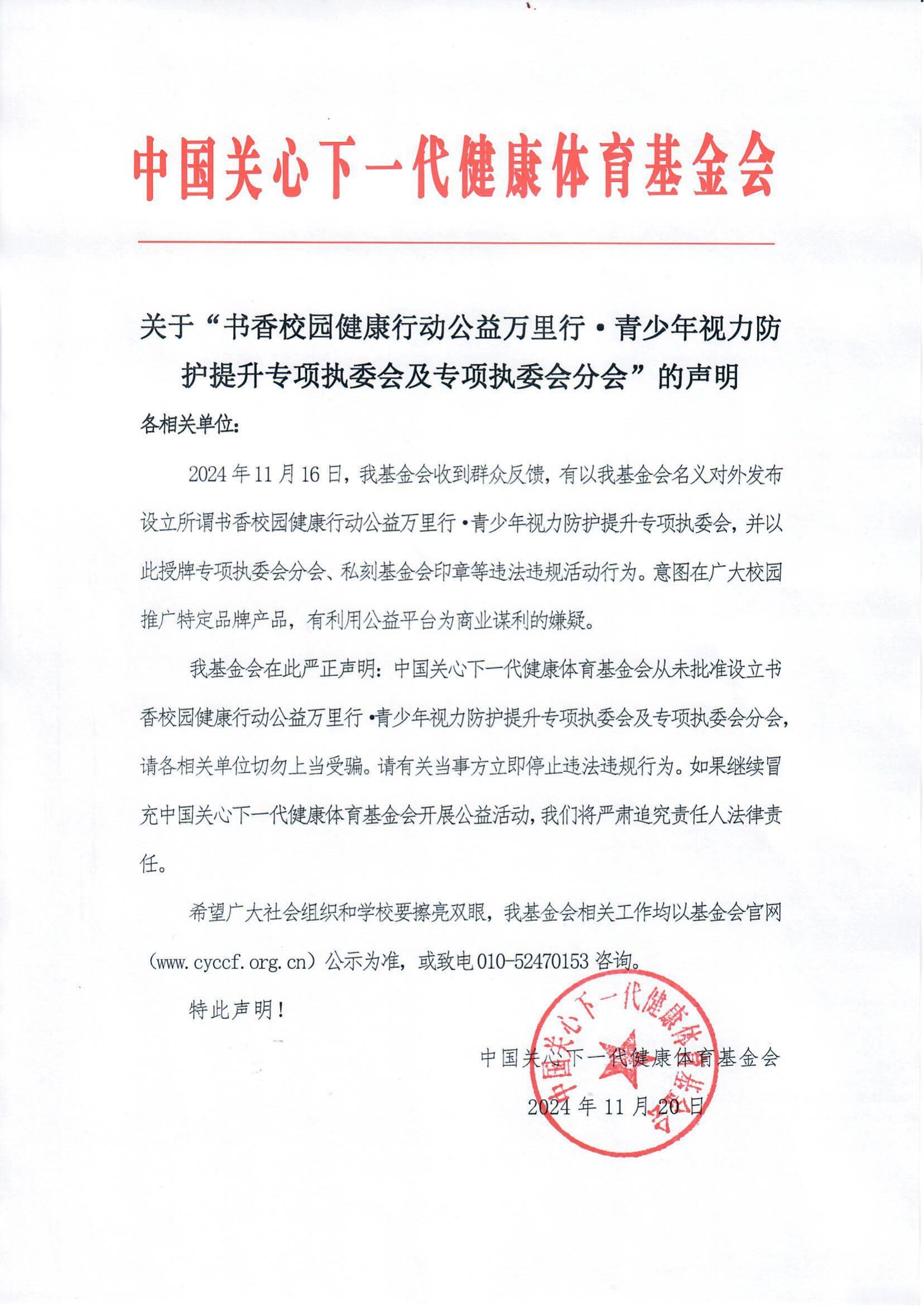 关于“书香校园健康行动公益万里行•青少年视力防护提升专项执委会及专项执委会分会”的声明