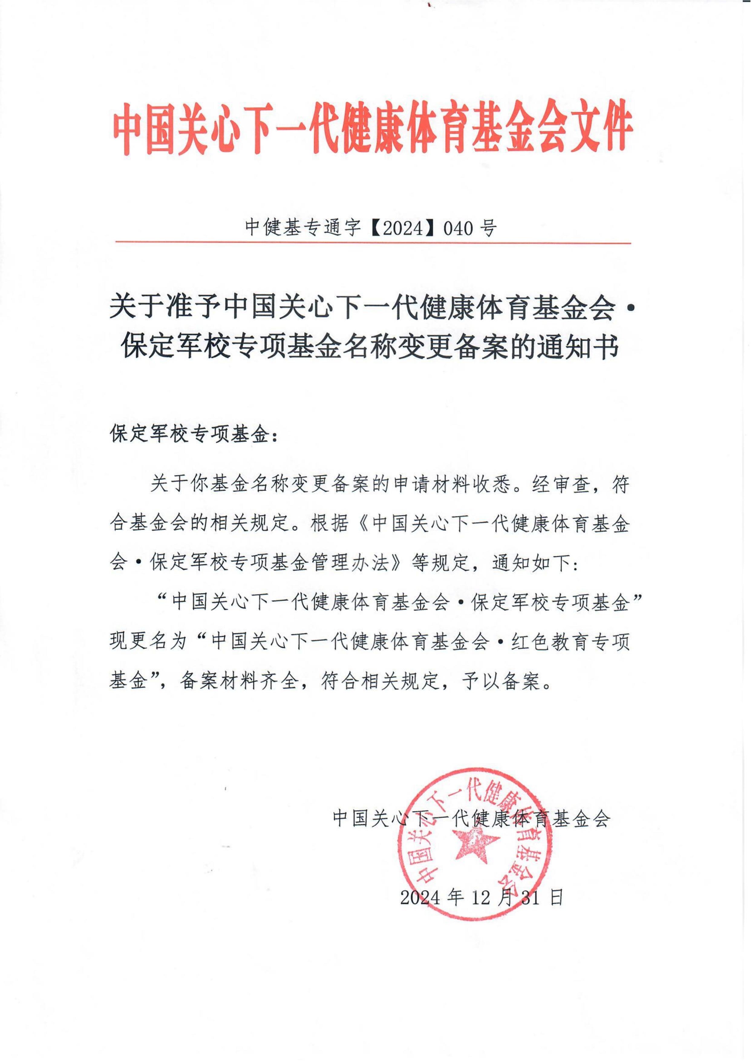 关于准予中国关心下一代健康体育基金会•保定军校专项基金名称变更备案的通知书