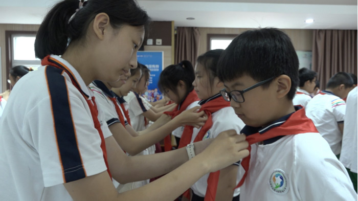 火红的队旗高高飘扬,指引我们前进的方向,鲜艳的红领巾系满理想,载着我们勇敢前进。在这个属于孩子的节日里,六年级同学向五年级同学授予代表着成长的大领巾,人大领巾大!人大责任大!人大志向大!