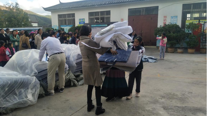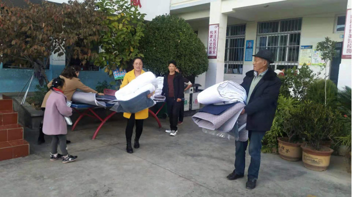 老师帮助分发爱心被褥