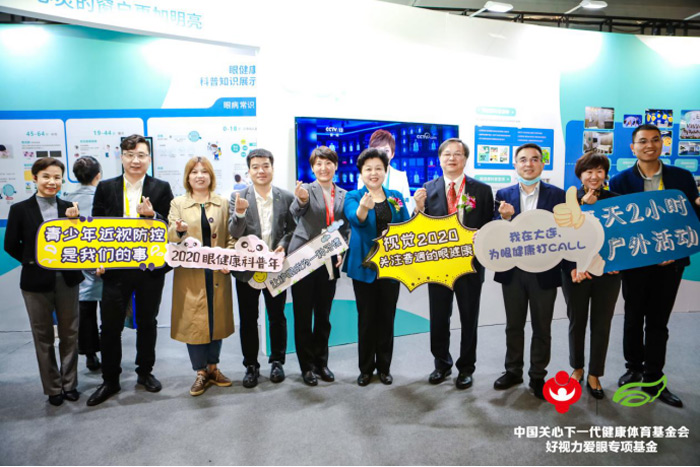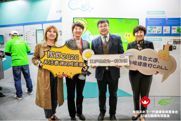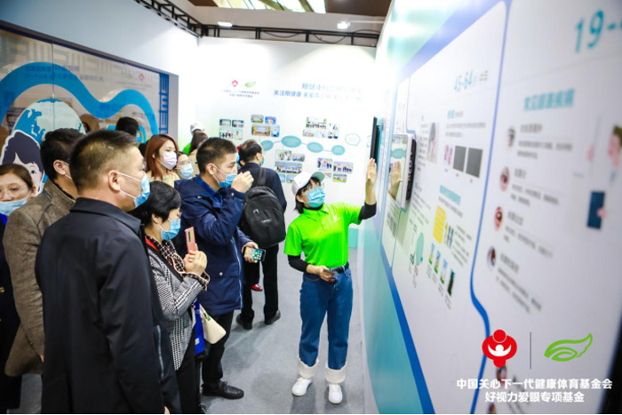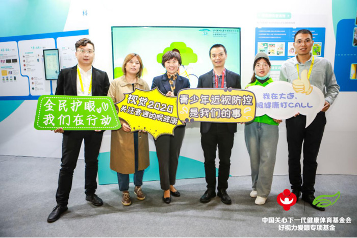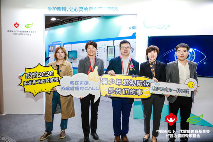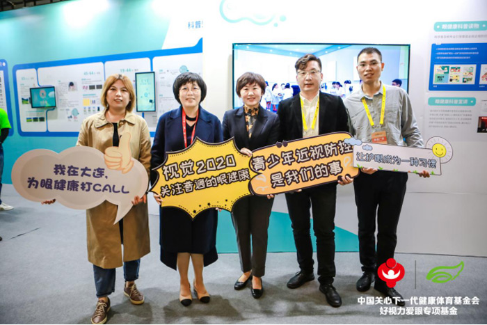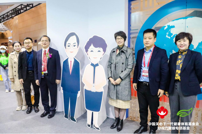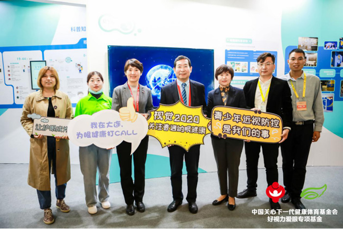 教育部体卫艺司副处长樊泽民(左四)莅临展位公益打卡。和好视力爱眼专项基金一起呼吁大家关注眼健康科普公益活动,青少年近视防控是我们的事儿!