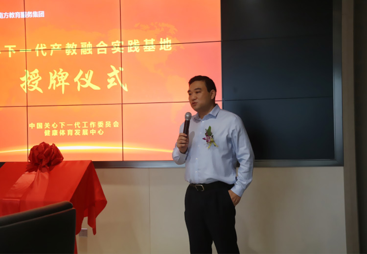授牌仪式上,新鸥鹏南方教育服务集团总裁龚林冲致辞。他指出,关工委健体中心与新鸥鹏南方教服集团结缘于2019年6月,在联合共建“一老一小生态一体化工程”中,先后开展了关爱社区“一老一小”、山区教育扶贫等多项公益活动。经过实地考察,中国关工委健体中心对新鸥鹏南方教服集团的运营能力和企业特色进行审核鉴定,新鸥鹏南方教服集团符合相关资质要求。经双方友好协商,决定在文化教育、产教融合等方面展开合作,并授予设立实践基地。