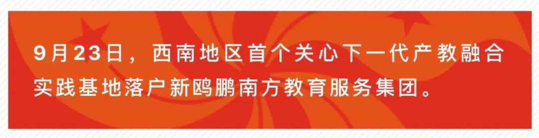 9月23日,西南地区首个“关心下一代产教融合实践基地”落户新鸥鹏南方教育服务集团,在产教融合中,全面贯彻党的教育方针,积极引导社会教育资源,培养中小学生的社会实践经验,丰富课外的生活阅历,引领素质教育,为青少年儿童提供一个健康的成长环境。