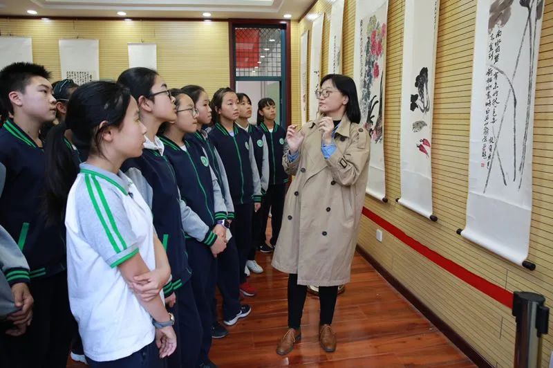 2019年的“齐白石艺术进校园”项目先后在大兴区的北京市大兴区第七中学、北京市大兴区庞各庄镇中心第二小学、北京教育学院附属大兴实验小学三所学校开展。尤其是在大兴区第七中学的活动,收获满满。大兴七中的美术老师吴鹏飞老师本身就热爱传统绘画,但是他也坦言由于时间和精力有限,难以进行很专门的研究,我们的活动正好帮助他为孩子补充了这些内容,讲座之后我们专门为吴老师寄去了北京画院出版的《齐白石研究》《白石老人自述》《品读经典 齐白石》等书籍,他组织孩子们观看了画册和书,又带孩子们临摹了齐白石作品,并反馈给我们经过了对齐白石的了解之后,孩子们临摹齐白石画作的热情高涨,是之前不能相比的,并且很多孩子对齐白石的作品慢慢有了自己的独特的观点和看法。之后,正好学校迎来国际交流活动,我们将齐白石作品的讲解文字发给学校,学校组织孩子进行了翻译,为美国中学生用英文进行了讲解,中美两国的中学生一起欣赏齐白石高仿精品,又一起在扇面上临摹了齐白石作品。