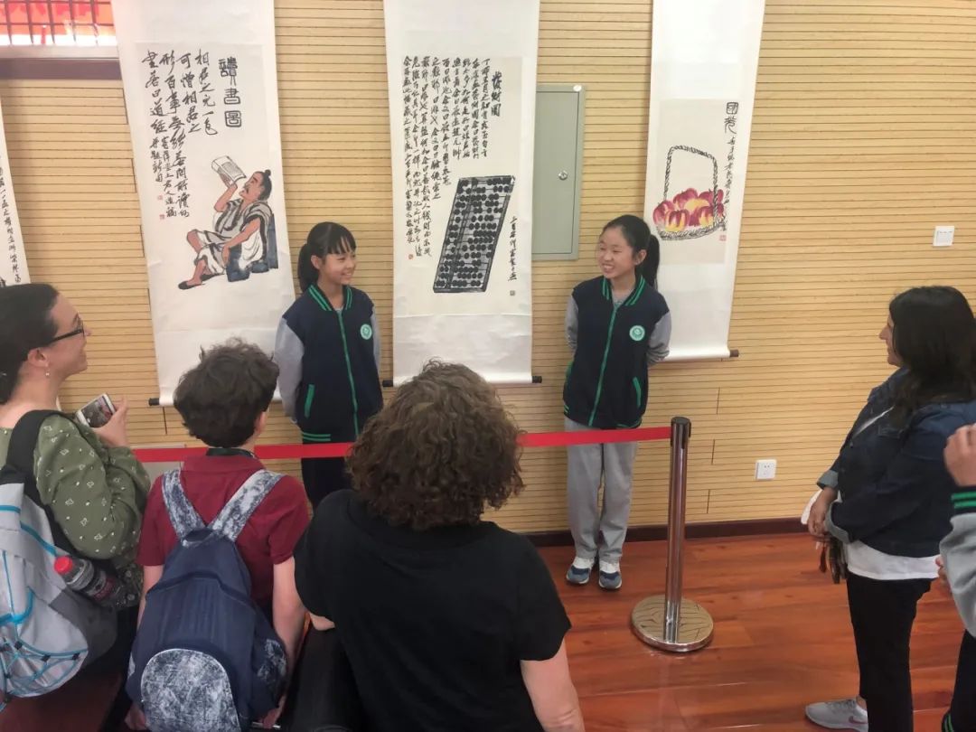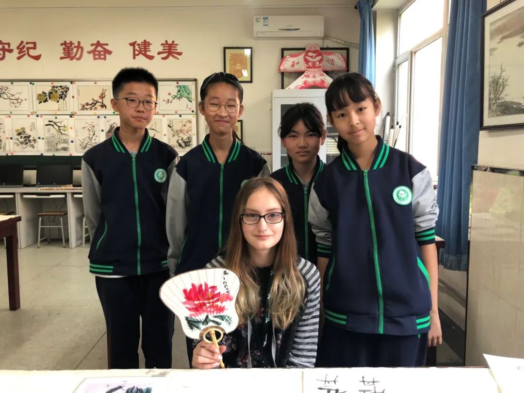大兴七中的孩子们为美国来的中学生用英文讲解齐白石艺术并一起创作中国扇面