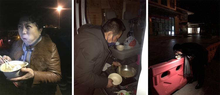 一路急行,终于在晚上23:30到达北京之外1000公里的封江服务区,浩天队员与同行的医师们一起休整,等待与另一辆前往郑州装物资的皮卡车。铁哥在车上为大家煮面,饥寒交加的医师专家吃着热汤面,满满地幸福。