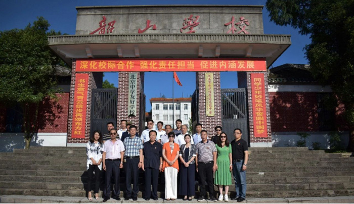 毛小青一行在韶山市政府副市长陈虹伶,韶山市政协副主席、市教育局副局长庞石林,韶山市教育局党委书记、局长郭四海,韶山学校校长陈煜华等相关领导的陪同下前往韶山学校参观。这是在韶山学校前合影。