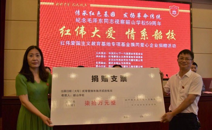 活动中,红伟爱国主义教育基地专项基金秘书长王珍(左)代表基金会向韶山学校捐赠现金支票70万元,韶山学校校长陈煜华接受了捐赠。