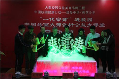 本年度“‘一代宗师’进校园 中国绘画大师赏析公益大课堂”活动启动仪式在传承大师精神的北京市艺术特色校徐悲鸿中学隆重举行,中国关心下一代健康体育基金会理事长郝毅先生,中国致公党北京市委专职副主委、西城区政协副主席、致公党西城区委主委刘学增先生,徐悲鸿艺术研究院院长、徐悲鸿之子徐庆平先生,李可染画院院长、李可染之子李庚先生,黄胄美术基金会理事长、黄胄之女梁缨女士应邀出席。中共西城区委统战部、西城区委教工委、北京画院美术馆、致公党西城区委、青少年素质教育基地发展基金的领导以及来自西城区10所中小学的领导和徐悲鸿中学师生代表参加了现场活动。