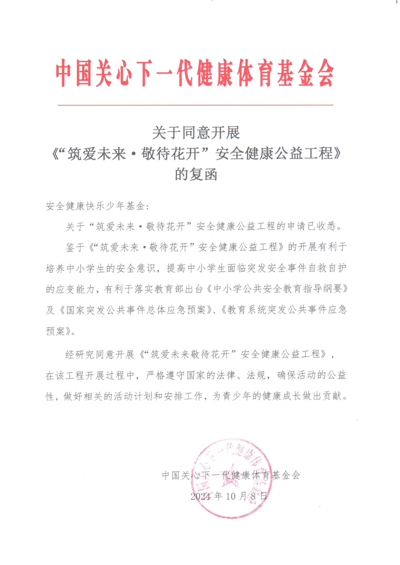 关于同意开展“筑爱未来·敬待花开”安全健康公益工程的复函