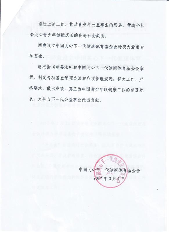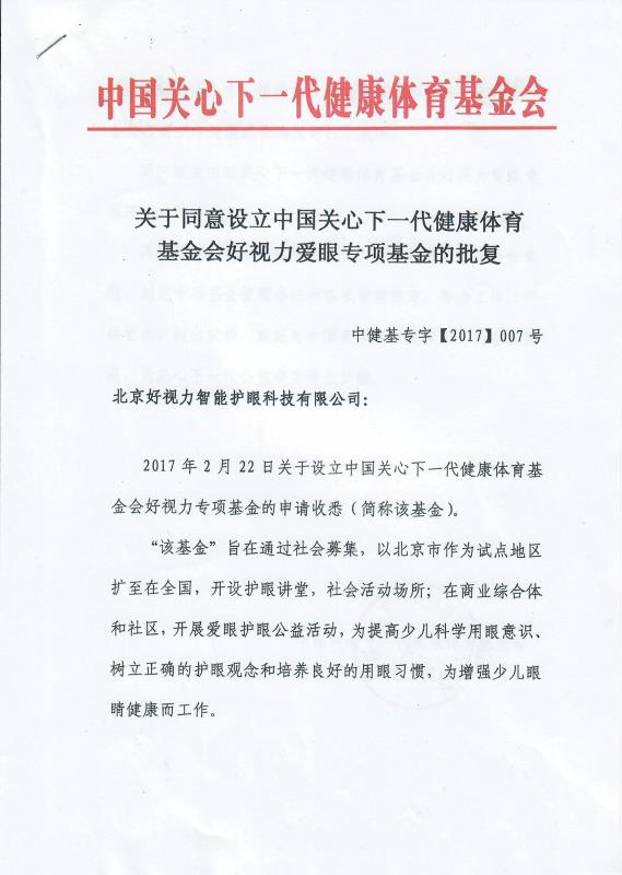 中国关心下一代健康体育基金会好视力爱眼专项基金计划在2017年努力实现建立10所小学爱眼大课堂,捐赠每所学校40台三维一体护眼仪,同时提供免费视力检测等服务。