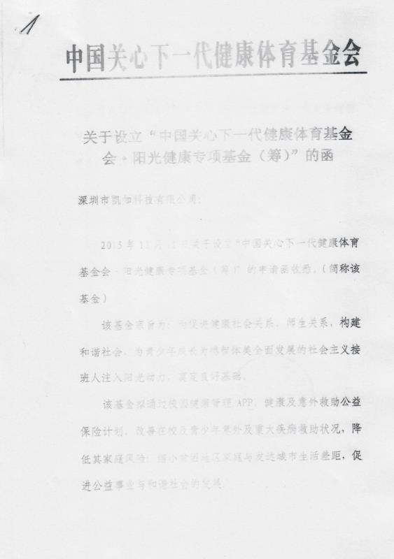2016年深圳凯如科技有限公司与我会发起了阳光健康专项基金,通过开展此项目对我国中小学生的意外伤害及重大疾病救助情况,进行了保险资助,降低其家庭经济风险,更好的保障青少年健康成长。 基础资金100万元。